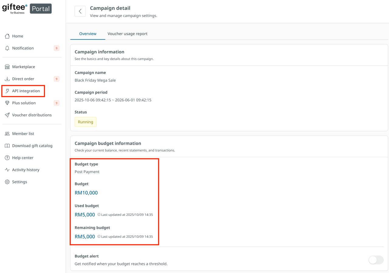 Currently, deposit balances cannot be retrieved directly via API. To view your remaining funds and manage your account, please use the giftee Business Portal.