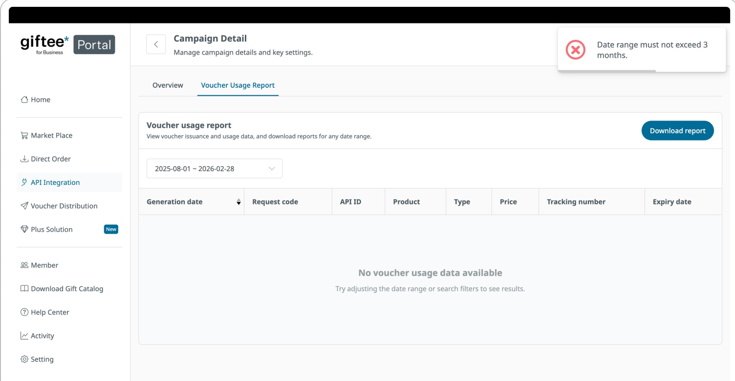 Client is having API integration with giftee can get the transaction report via Giftee for Business Portal, https://portal.giftee-biz.asia/