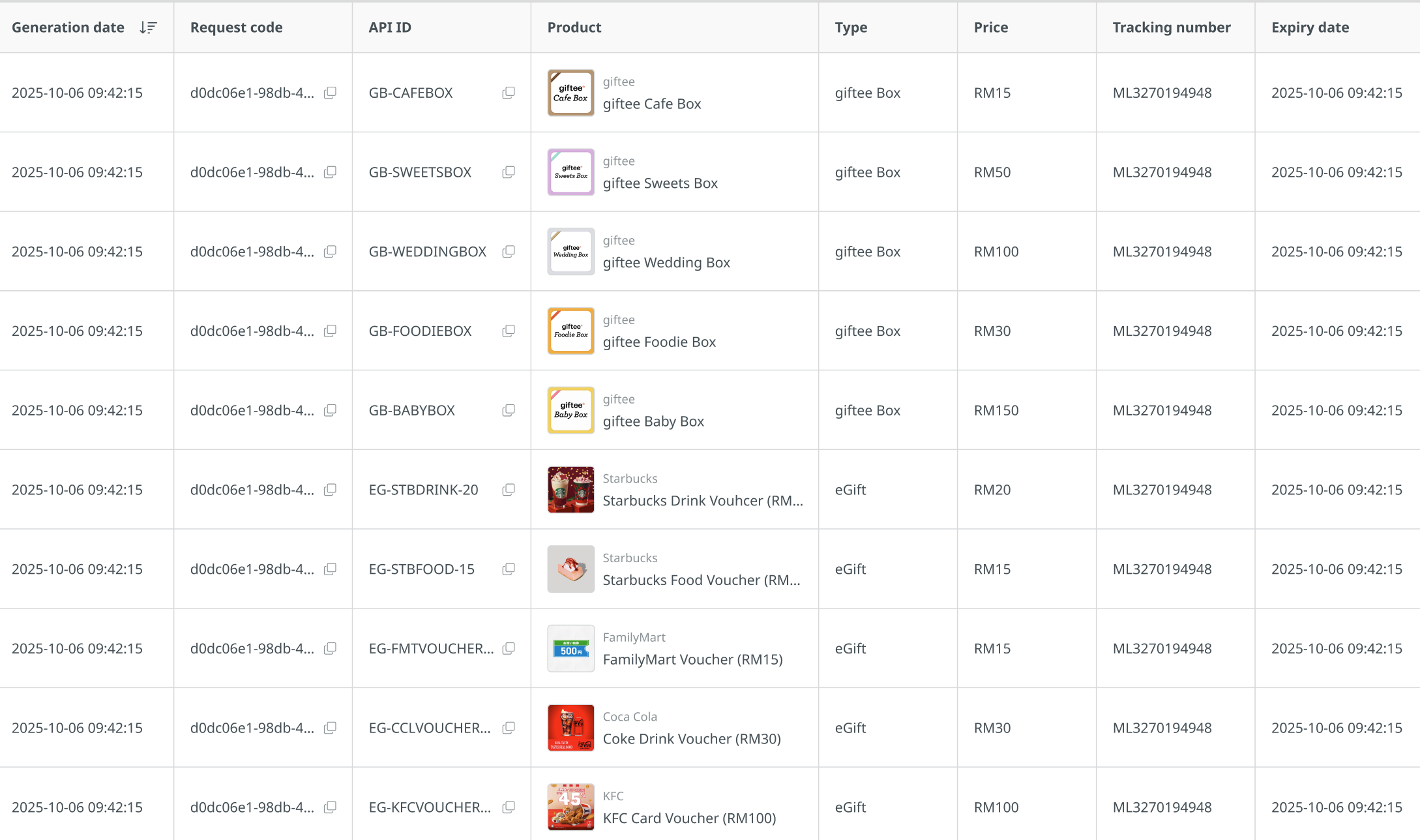 - Product: The name and brand of the gift (e.g., Starbucks Drink Voucher, giftee Cafe Box).