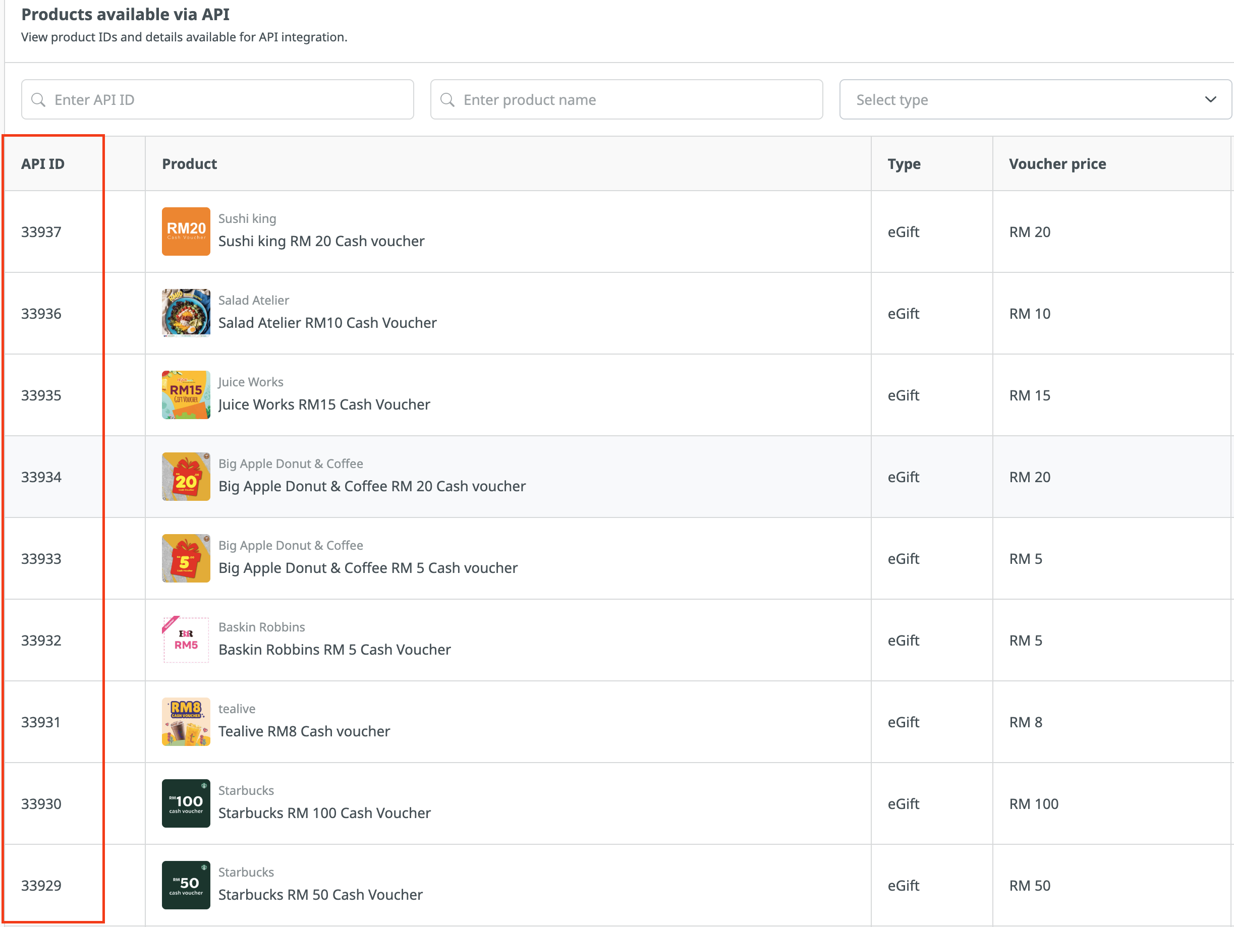 - API ID: A unique identifier assigned to each product, used when calling the API.