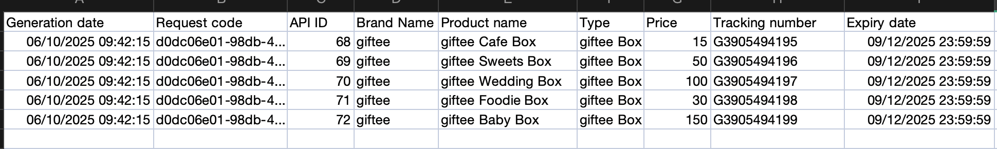 - Tracking number: The unique reference number for that specific gift unit.