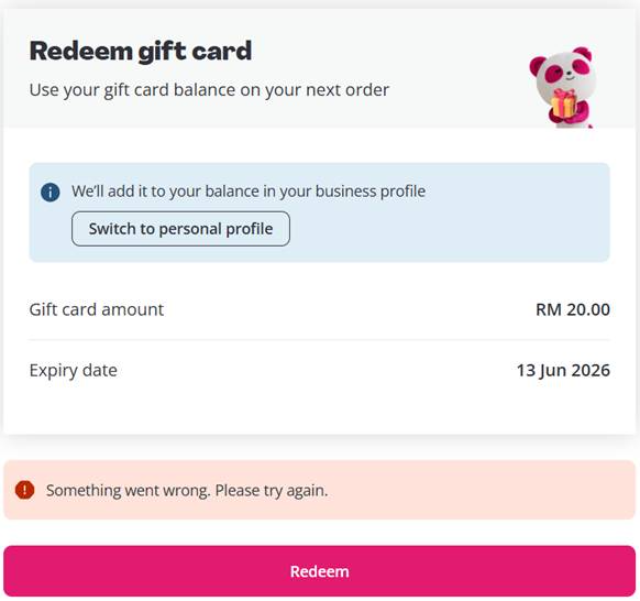 If you encounter any errors while redeeming your Foodpanda gift card, please ensure the following before accessing the URL: